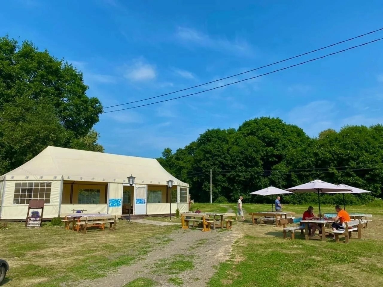На территории базы располагается кафе с летним шатром, где можно заказать комплексное питание и провести праздничное мероприятие.